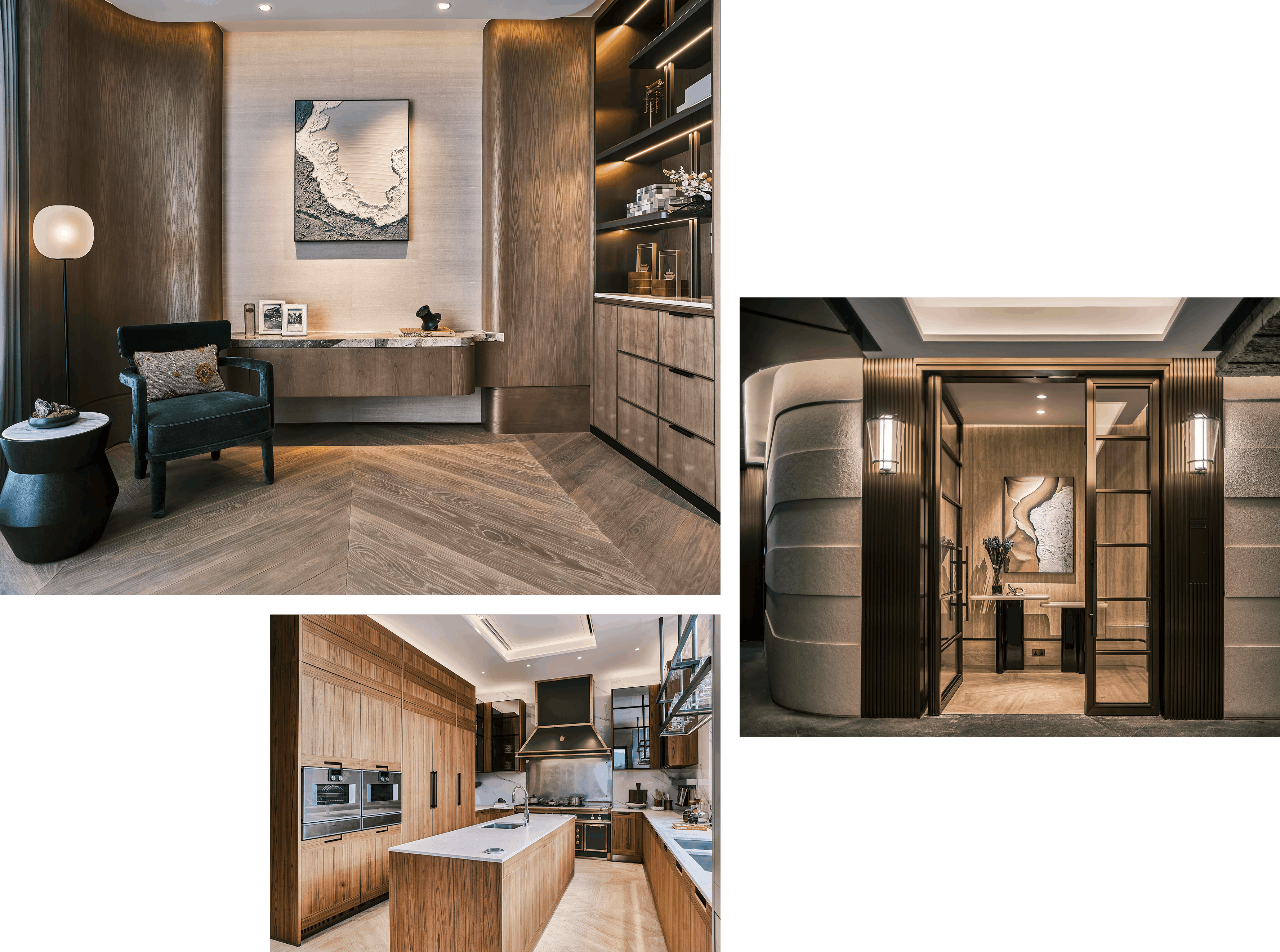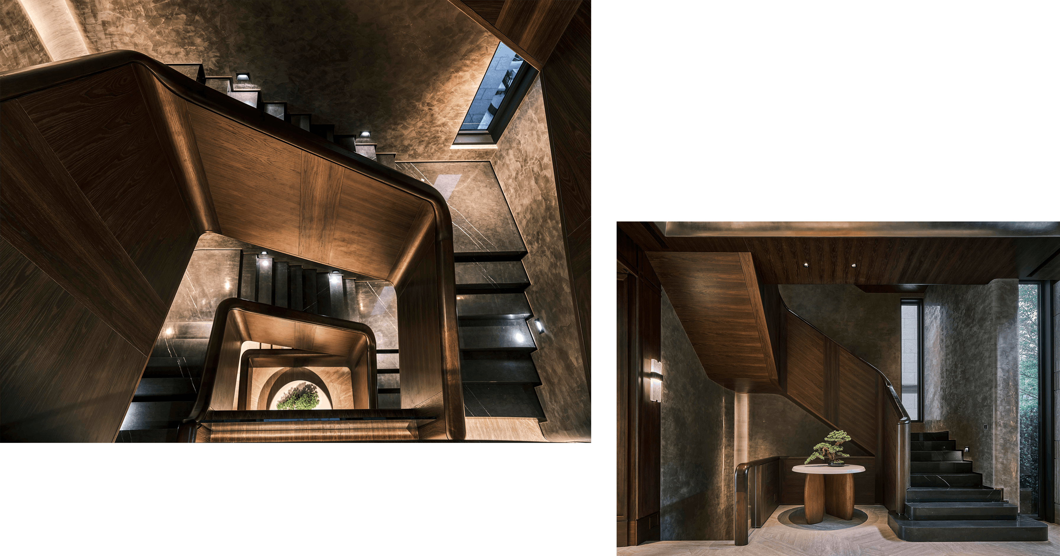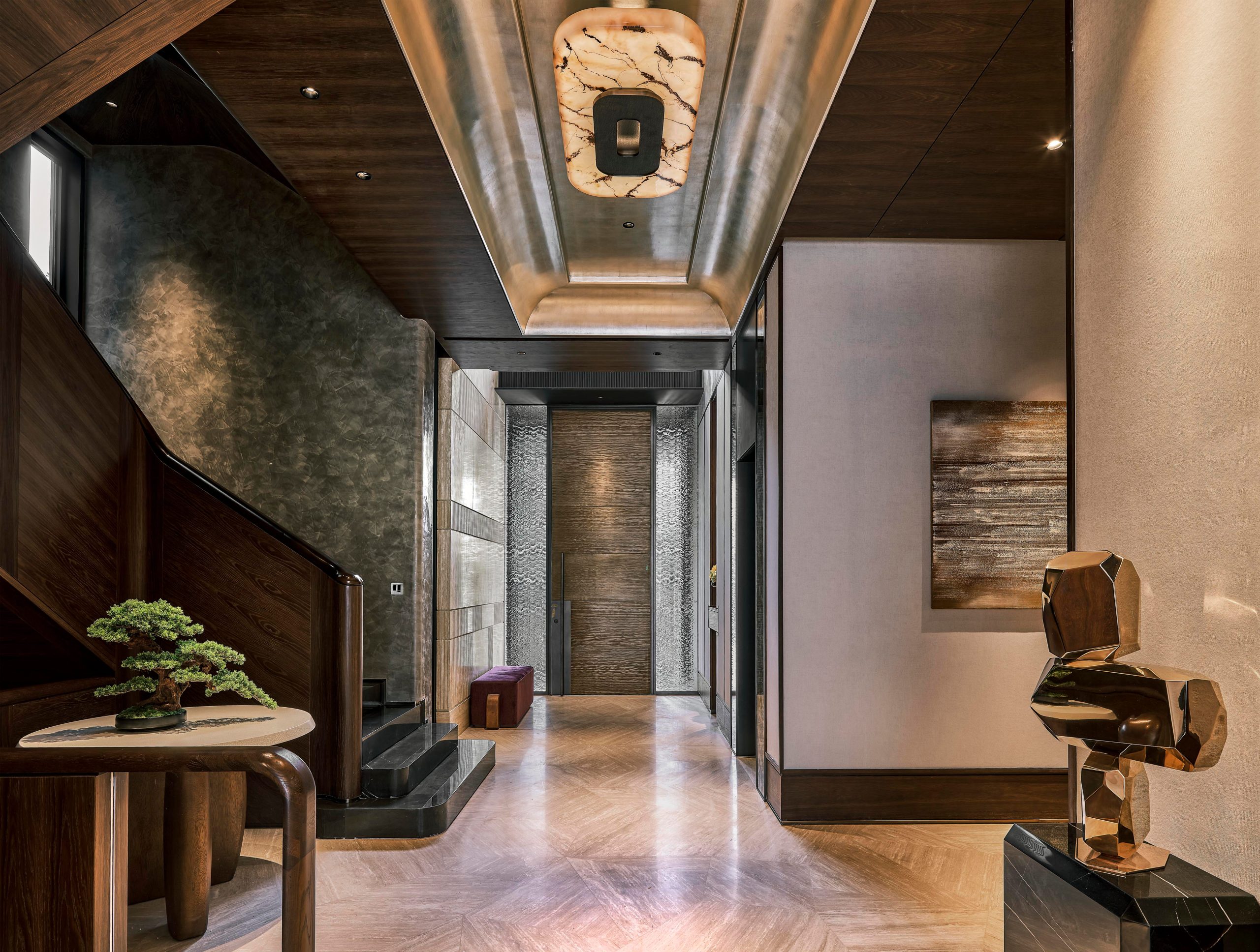 Perched atop Tai Po’s verdant hills, Shanyucommands grandeur through deliberate spatial axes and framed vistas. The double-height Foyer unfolds with grooved stone walls, a silver-leaf ceiling with an alabaster pendant, and a sweeping smoked oak staircase.