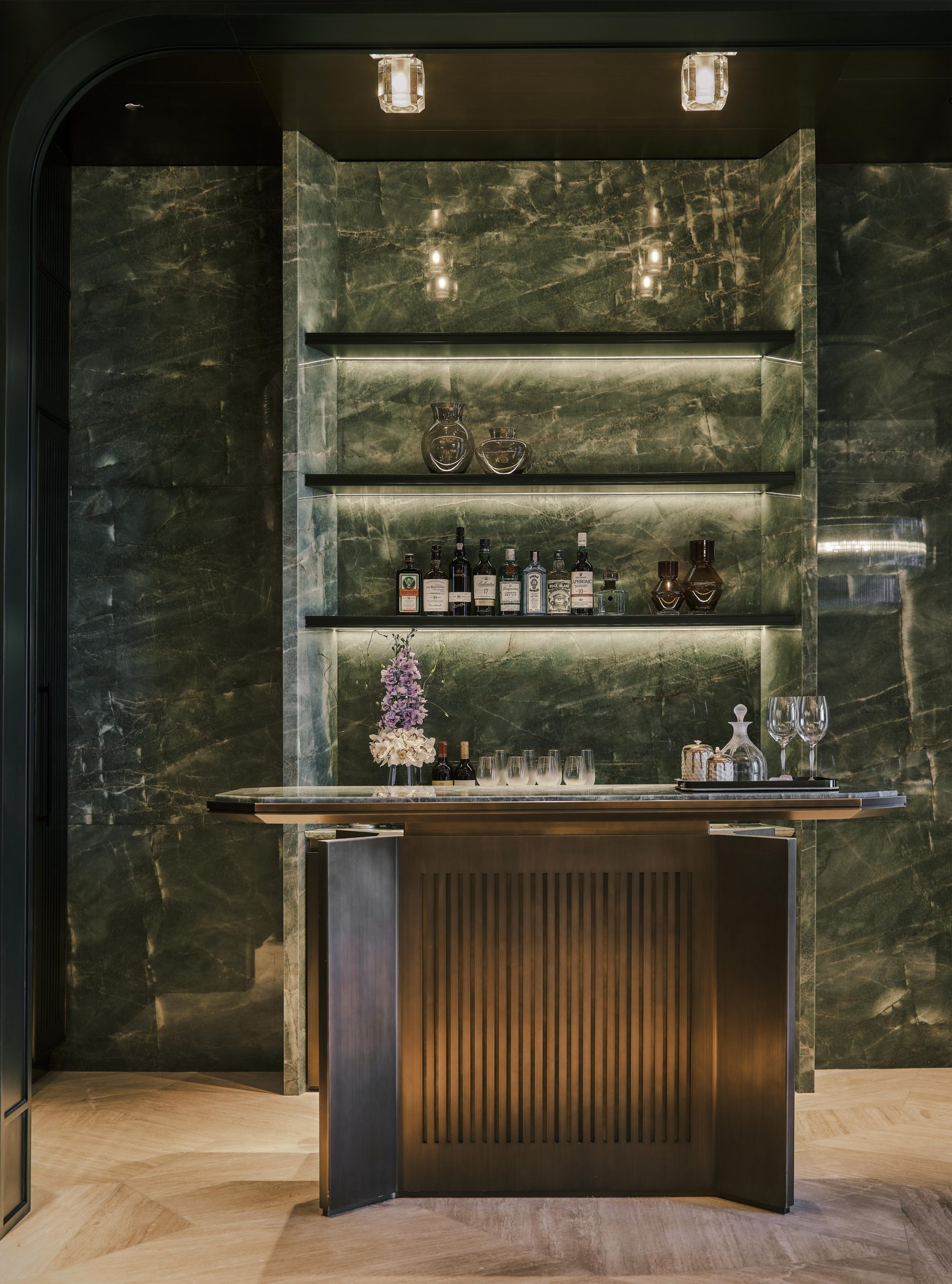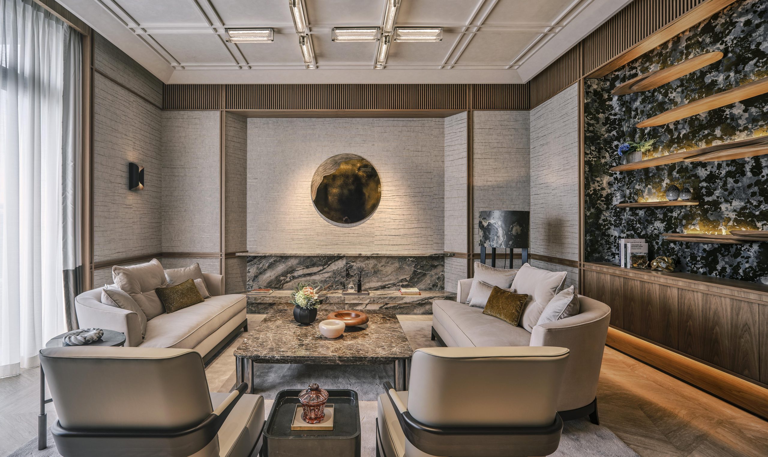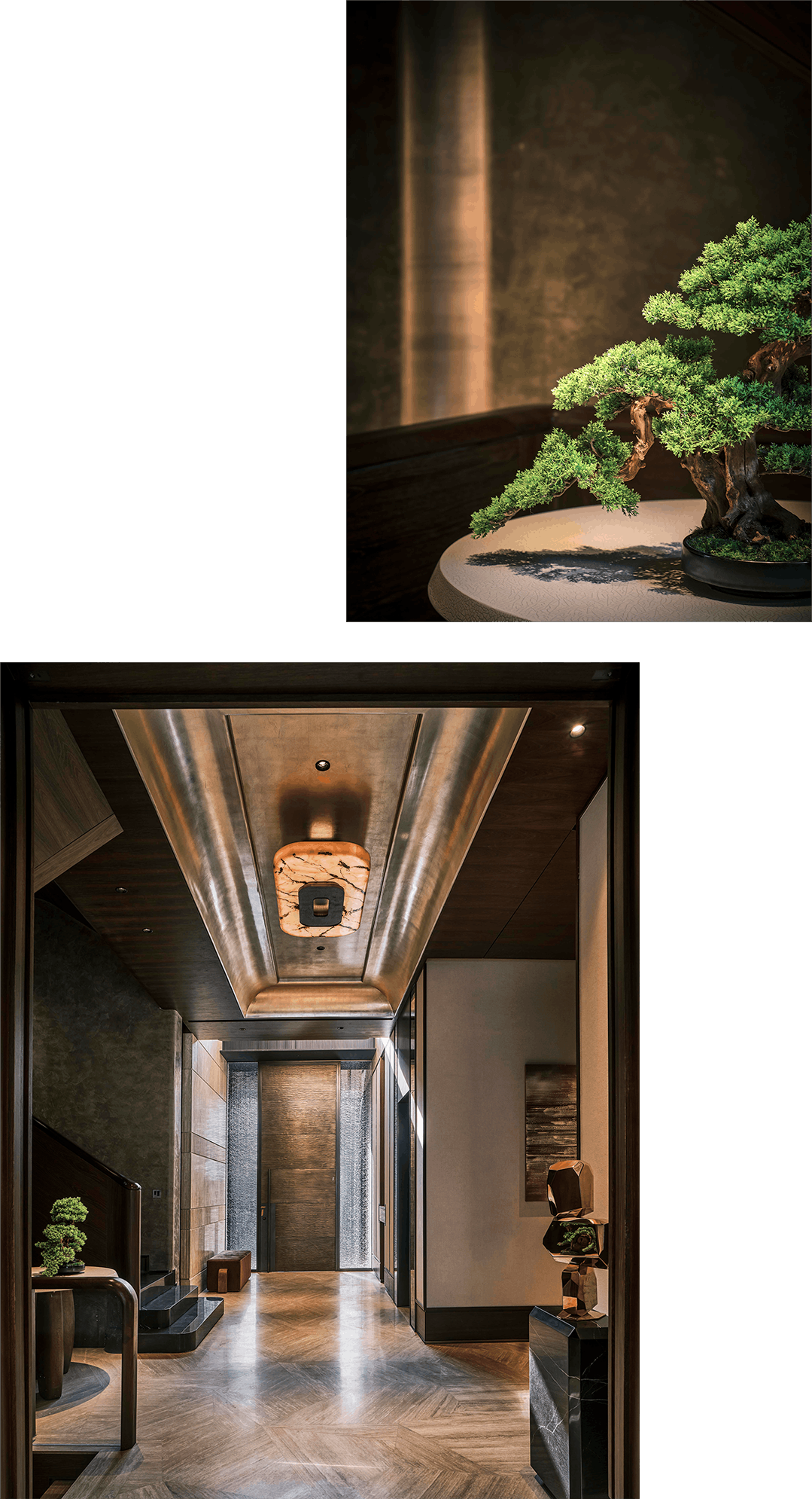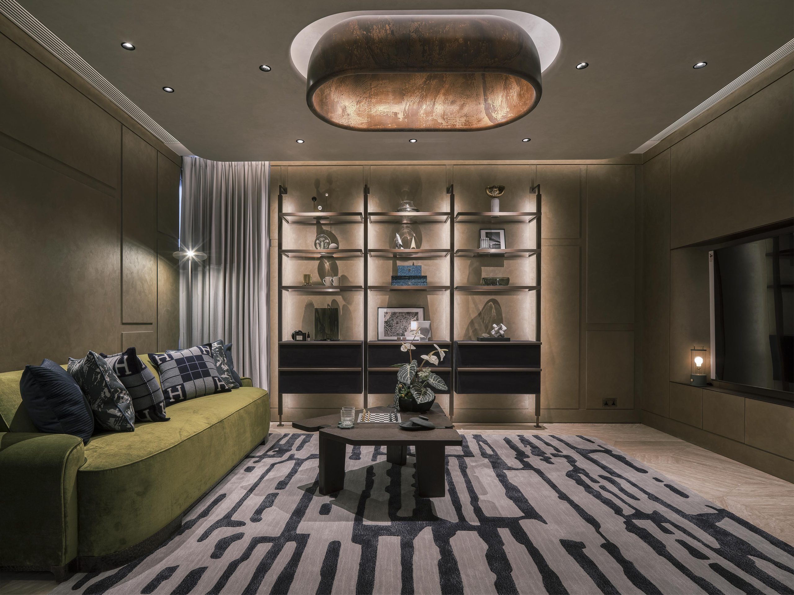 Perched atop Tai Po’s verdant hills, Shanyucommands grandeur through deliberate spatial axes and framed vistas. The double-height Foyer unfolds with grooved stone walls, a silver-leaf ceiling with an alabaster pendant, and a sweeping smoked oak staircase.