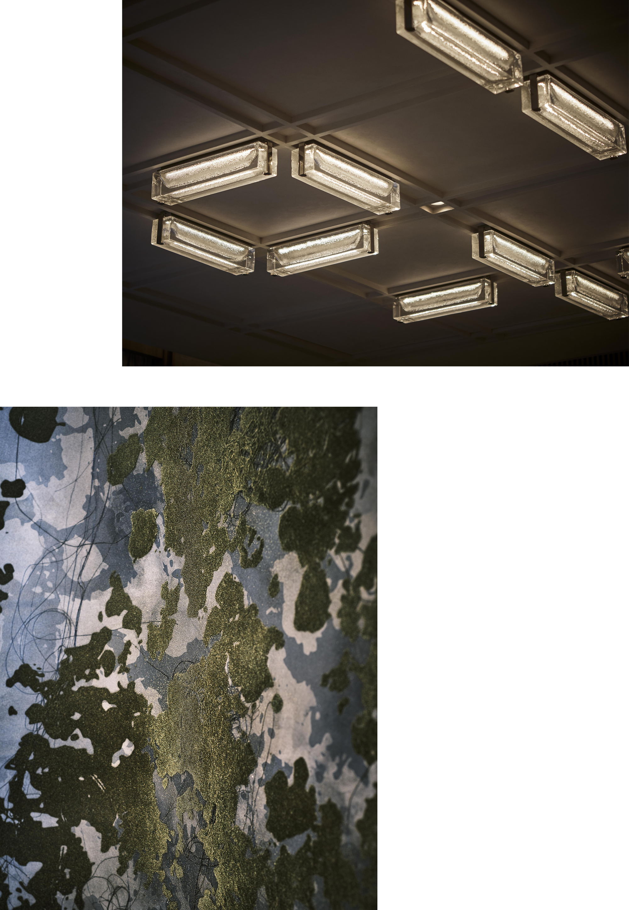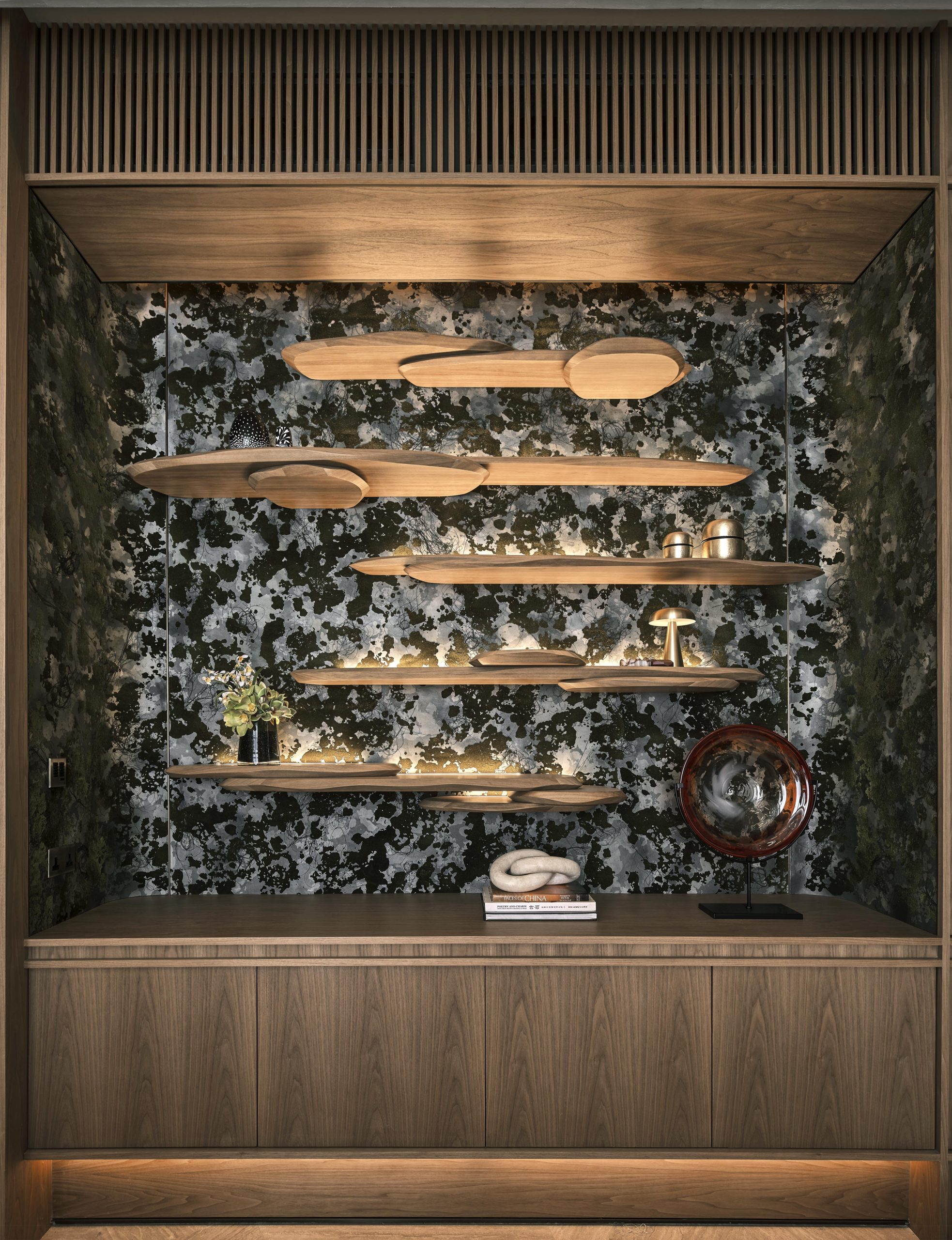 The Salon, the home’s central living space, is anchored by a high ceiling adorned with Ricardo Lighting’s cast glass pendants, reminiscent of morning dew. The walls, lined with timber-trimmed coverings and sculpted “mushroom” shelves, creates a backdrop to the view outside.