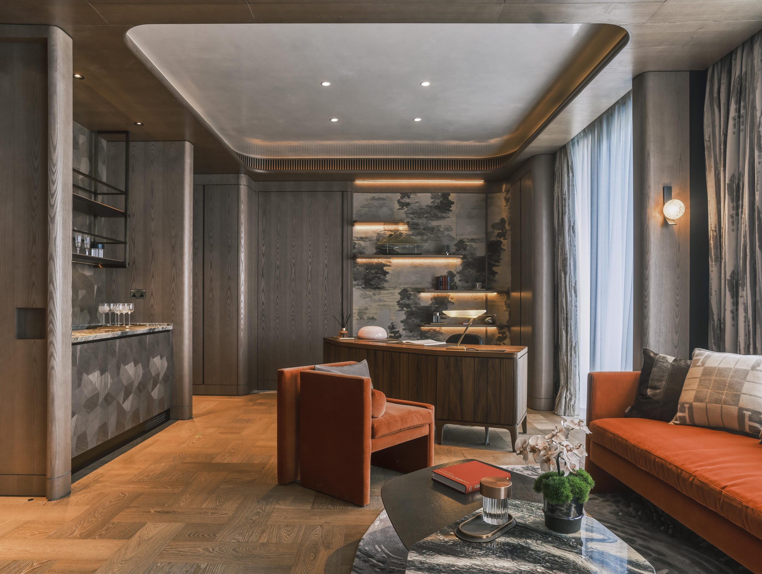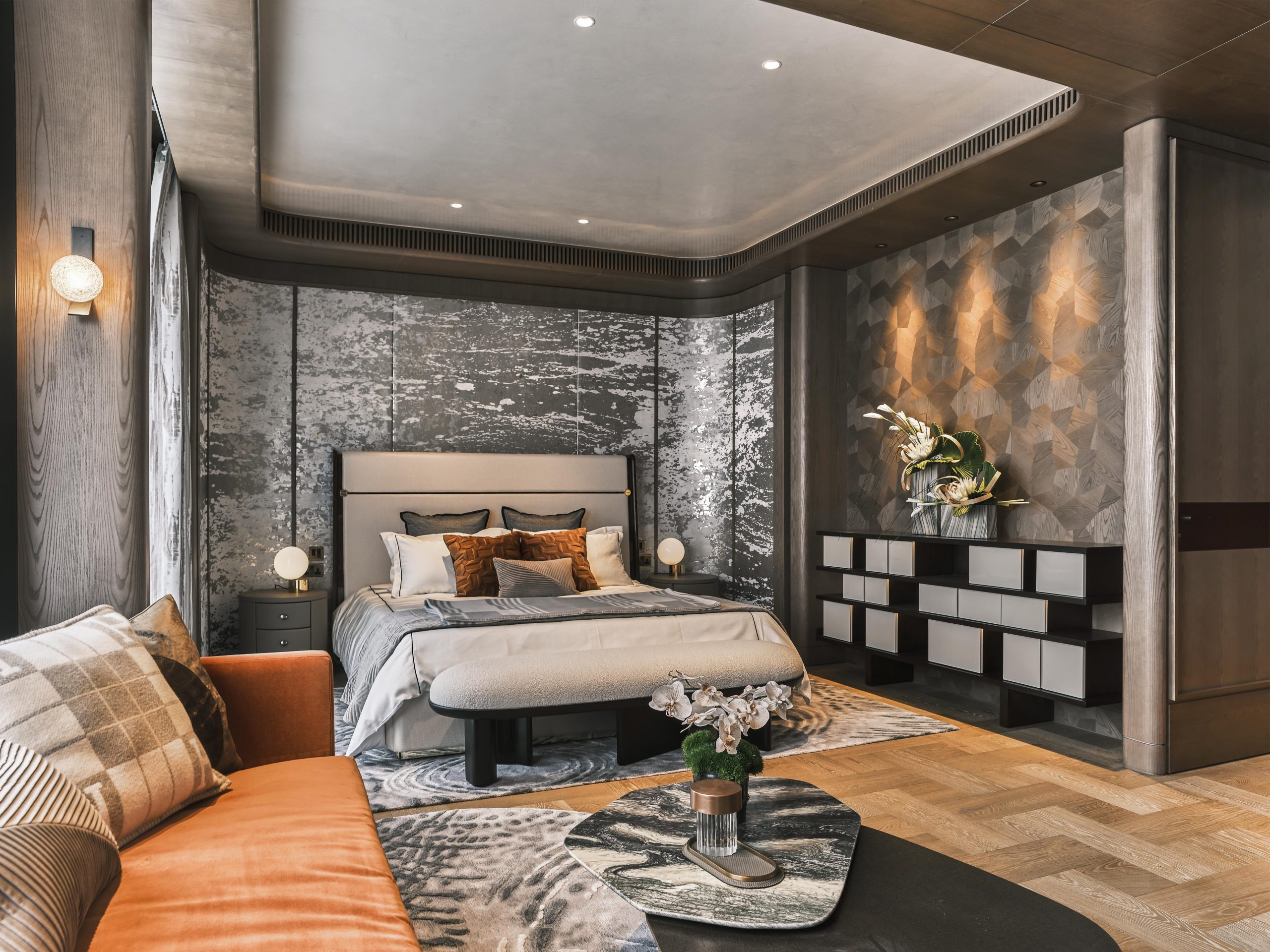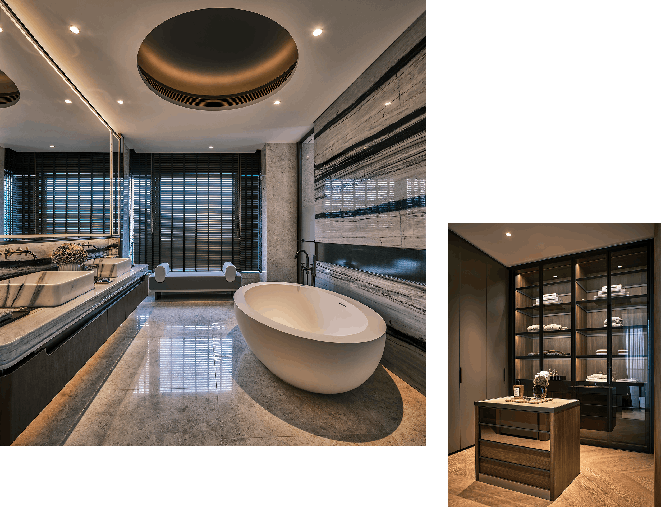 The Master Suite features an Asian-inspired palette with a warm, basket-weave timber floor, cloud-patterned textures, and polygonal wood panelling. In the Master Bathroom, Sichuan bamboo white marble evokes the strokes of Chinese ink brush painting.