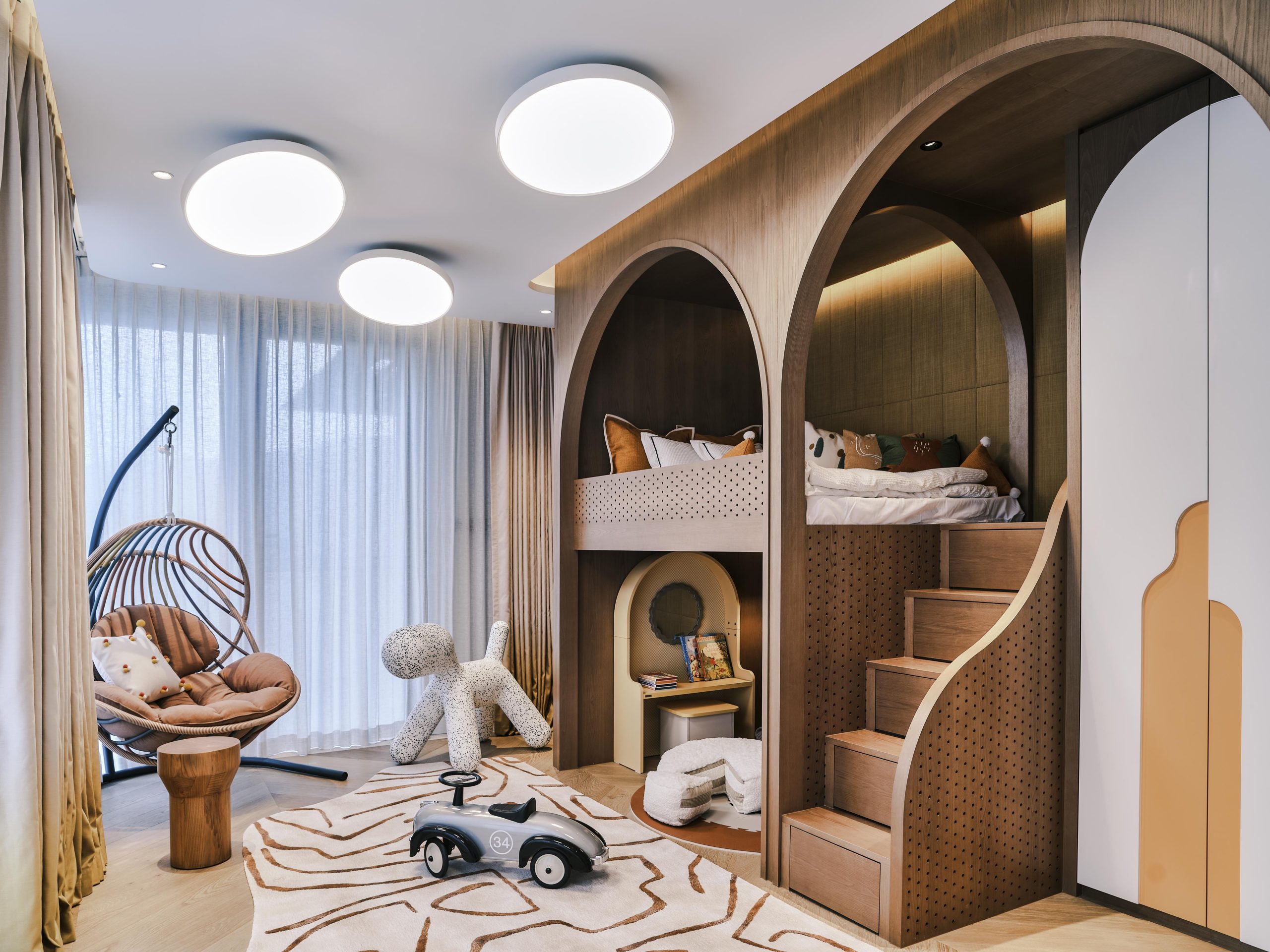 The Playhouse on the Second Floor is equipped with a playful bunk bed in timber and upholstery pads for growing kids enjoying sleepovers.